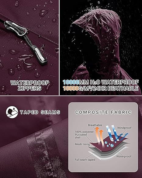 - Enhanced Waterproof: Womens raincoat features high density polyester fabric with 100% fully sealed and membrane, with 10000mm in waterproof level. All zippers outside are 100% fully sealed, prevents water droplets from soaking through the inside garment’s surface, keeping you completely dry.