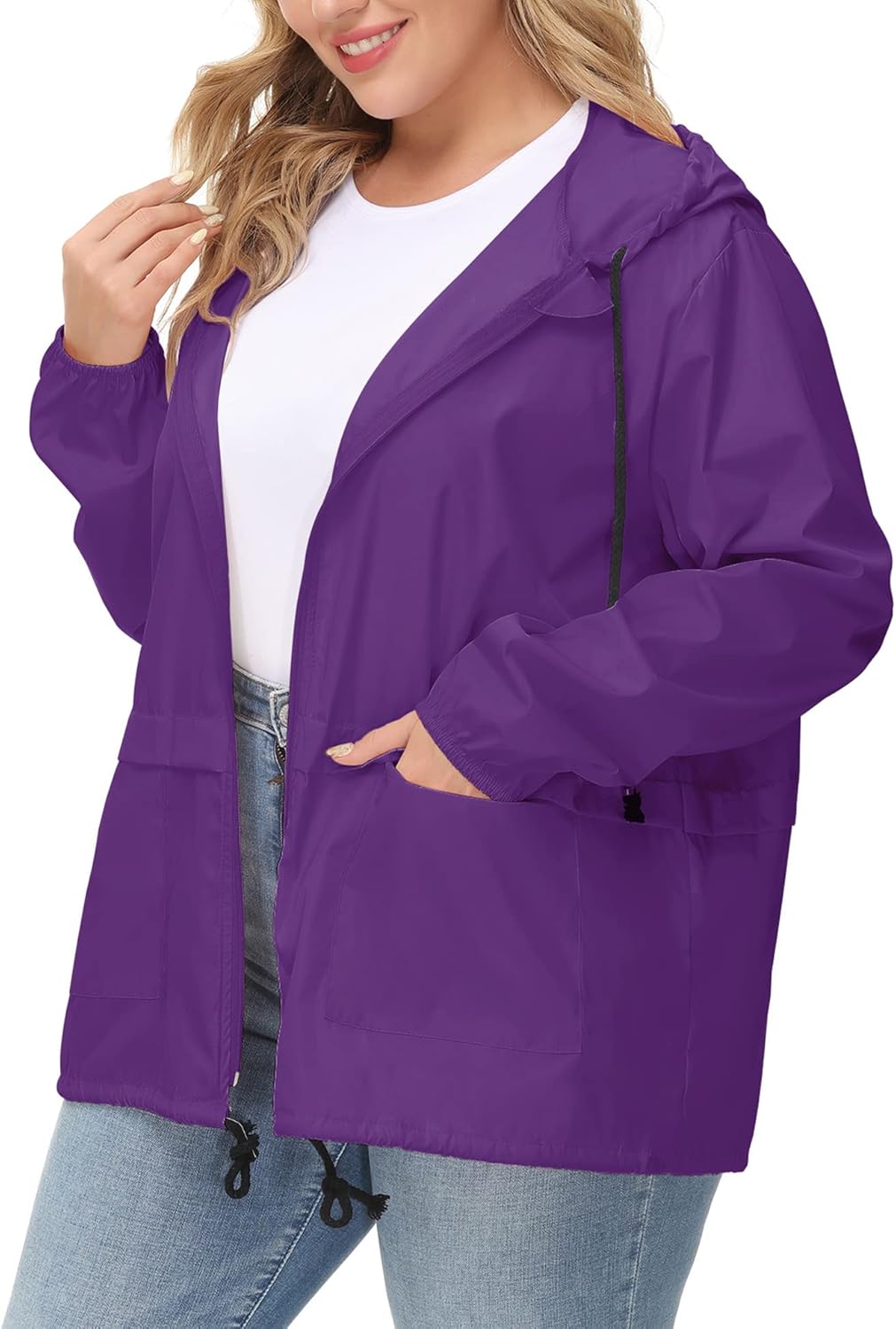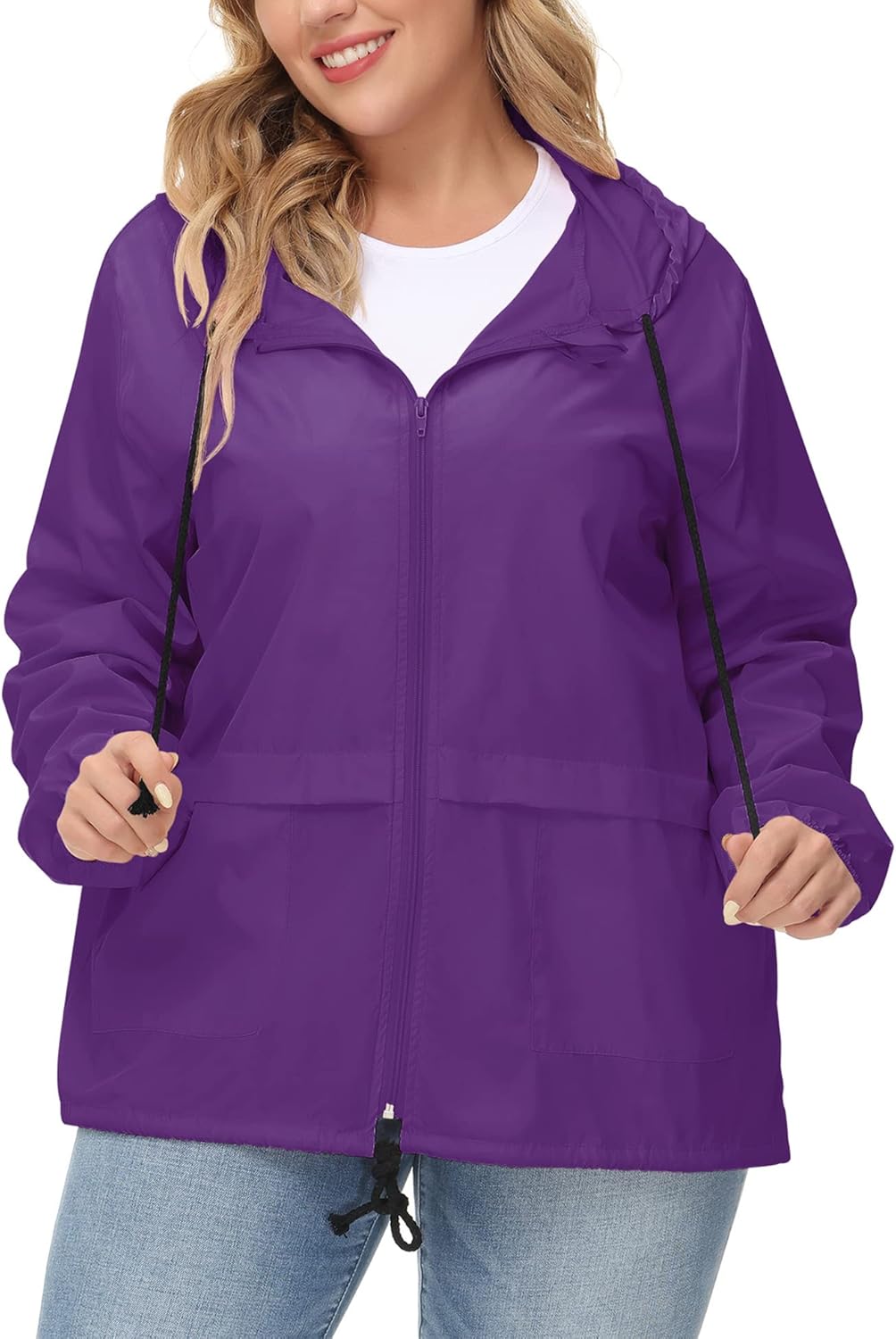 - WATERPROOF& WINDPROOF RAINCOAT: This plus hooded rain jacket is made of super waterproof material, it’s lightweight, breathable, packable, skin-friendly, comfortable to wear, It will keep you dry and cool in every rainy days.