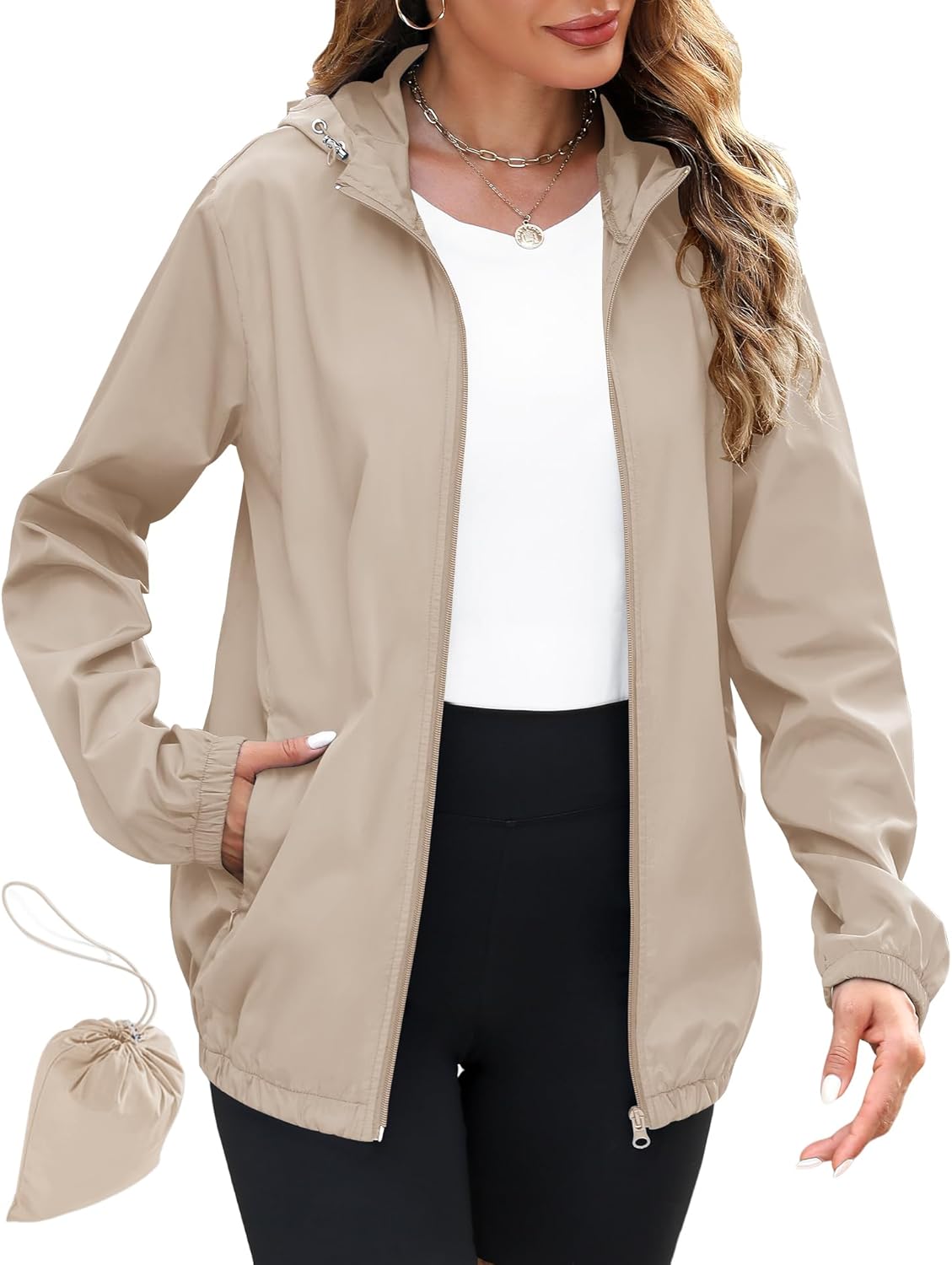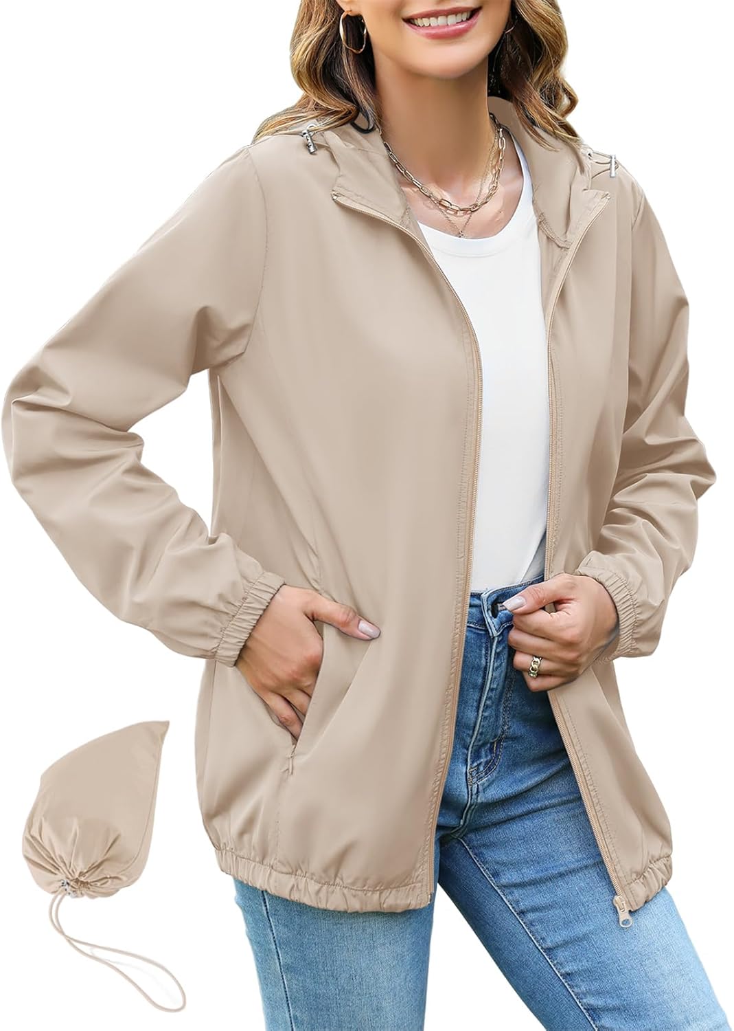 - Lightweight & Packable Jackets: :Womens rain jacket can be easily folded into the carrying Pouch and easy to put it in your bag when you need to go outside and suitable for all season, anti-UV for Summer, waterproof for Spring, winderbreaker for Autumn, casual loose fashionable style.